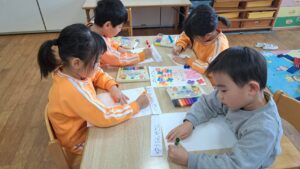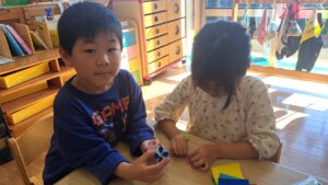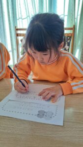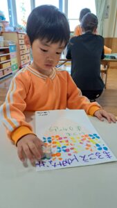 年長のゆり組さんは折り紙で花やリボンを折ったり、文字を書いたりしました💡