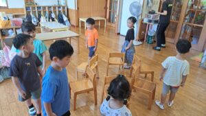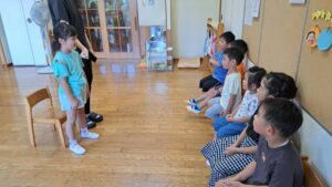 たんぽぽ組さんはゆり組さんをまねしながら、