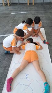 大きな模造紙の上で好きなポーズをとってペアのお友達が縁取り、どんどん線を重ねていきました😊