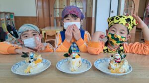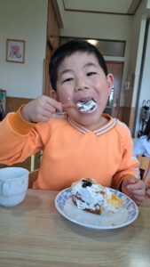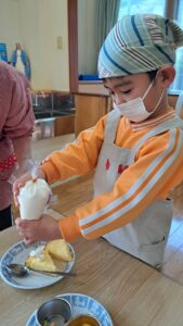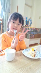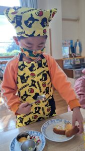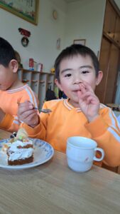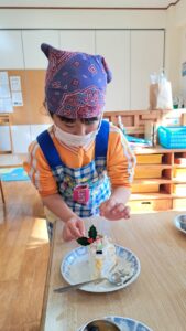 おやつはクリスマスケーキということで、ゆり組さんは自分のケーキを自分でデコレーションしました✨️