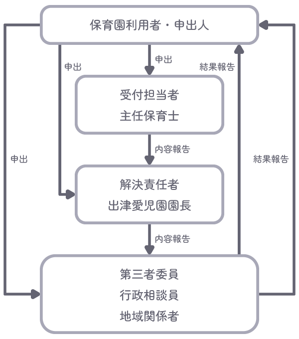 出津愛児園では、利用者の皆様と園のコミュニケーションの活性化を目指して、「意見・要望・苦情・不満(以下「要望等」とする)を解決するための仕組みに関する規定」をもうけ、利用者の皆様の要望等に的確に応え、よりよい保育園づくりを進めて参りたいと考えております。